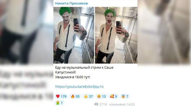 Внук эстрадной певицы Аллы Пугачевой музыкант Никита Пресняков удивил своих подписчиков перевоплощением в персонажа комиксов DC Джокера.