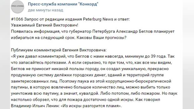 «Я уже давал комментарий, что Беглов с нами навсегда, минимум до 39 года. Так что запасайтесь протезами. А если серьезно, то при том, что, как все мы видим, Беглов не приносит никакой пользы городу, он создал уникальную, прекрасно продуманную систему дележки городских денег, зданий и территорий группе заинтересованных лиц», — приводит слова бизнесмена пресс-служба компании «Конкорд».