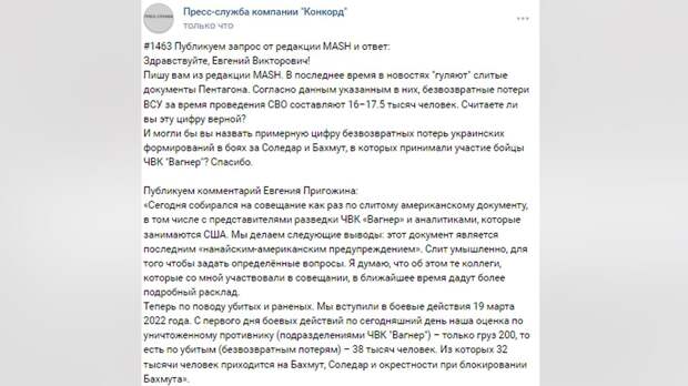дадут более детальную информацию по этому вопросу. Пригожин также высказался о сведениях касательно потерь со стороны ВСУ. Он напомнил, что ЧВК «Вагнер»