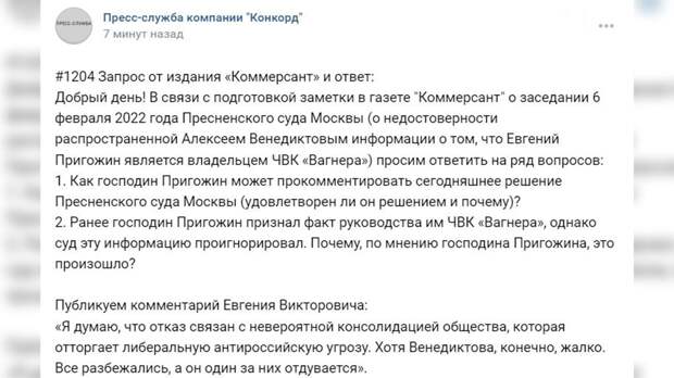 Журналисты издания «Коммерсант» обратились в пресс-службу бизнесмена с просьбой прокомментировать решение Пресненского суда Москвы по итогам заседания 6 февраля 2023 года. Суд отказался пересматривать возникший спор между Пригожиным и Венедиктовым. Бизнесмен ответил на вопрос, удовлетворен ли он решением суда.