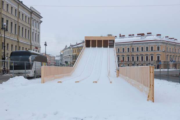 Петербургские чиновники распорядились о строительстве в центре города детской горки. Аттракцион отстроили всего в паре метров от проезжей части.