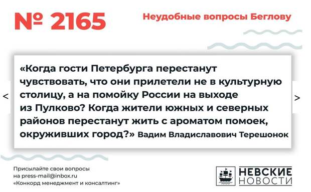 В первую очередь, горожане хотят знать, когда Петербург начнут нормально убирать зимой. На плохую уборку снега и наледи жалуются как пешеходы, так и автомобилисты. Первые просят губернатора рассказать о марке ботинок, которые выдерживают такую снежную грязную «жижу» и смесь реагентов. Вторые опасаются, что омывающее средство для стекол закончится в процессе поездки, и тогда ДТП будет просто не избежать, ведь грязь на дорогах никто не убирает.Другим крайне неудобным вопросом стали итоги мусорной реформы. С момента ее реализации прошел год, а улицы и дворы города до сих пор попахивают. При этом новый экологический оператор «НЭО» регулярно поднимает тарифы, хотя мусор вывозят те же компании и на прежние полигоны, сообщает Елена Волкова в своем вопросе. Также горожане возмущены медленными темпами строительства транспортной инфраструктуры. По словам одного из петербуржцев, Большой Смоленский мост должны были построить еще в 1985 году, но он не появился до сих пор. Та же ситуация со станциями метрополитена, некоторые из которых строятся десятилетиями. «Скажите, пожалуйста, почему строительство и развитие метрополитена в Санкт-Петербурге идет такими медленными темпами? Почему заморожено строительство станции "Адмиралтейская-2" на Невско-Василеостровской (зеленой, третьей линии), несмотря на то, что сама станция под землей уже давно построена? Планируется ли ввод ее в эксплуатацию и когда?», — спрашивает Константин Мехнин. Еще одним неудобным вопросом стала вечная очередь на получение квартиры. «Добрый день! Хотела бы услышать от Беглова конкретный ответ: когда, наконец, будет предоставляться муниципальное жилье очередникам общей очереди? Люди по 40 лет стоят в очереди, ему не стыдно? Почему отклонил поправку "Яблоко" к бюджету на 2023 год увеличить финансирование на решение данной проблемы? Одна болтология и бравада», — пишет Елена Серебрякова. Жители Петербурга возмущены ужасным состоянием дорог, транспорта, исторических памятников и многим другим в городе. Они пишут, что Северной столице «не везет с губернаторами» и надеются, что пресс-службе компании «Конкорд» удастся передать их вопросы Беглову, ведь на его странице в соцсети неудобные сообщения удаляются.